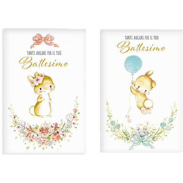 BIGLIETTI BATTESIMO CONIGLIETTI ROSA AZZURRO